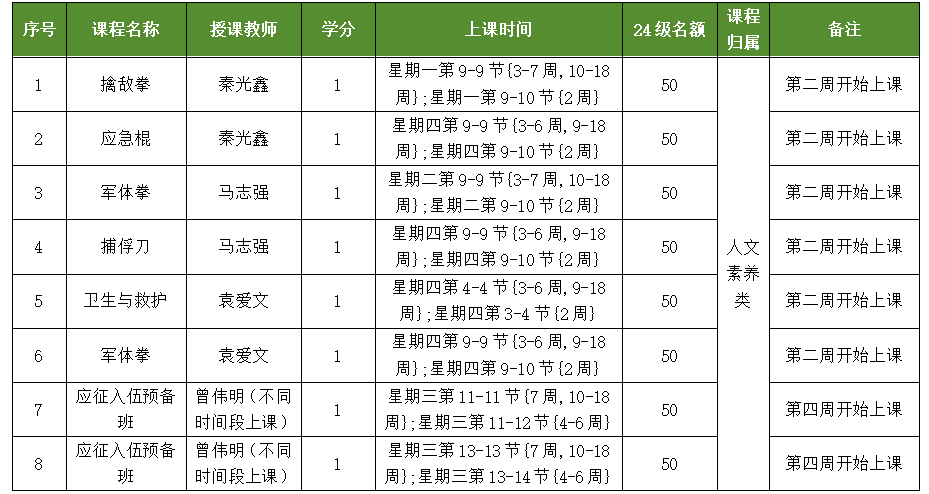 为深入贯彻落实学校人才培养方案,强化通识教育课程体系建设,进一步彰显我校军事体育教育特色,增强学生国防观念、身体素质与综合素养,现组织开展2025-2026学年第一学期2024级军体选修课选课工作。